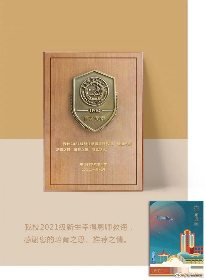 中国科学技术大学2021年录取通知书主题为致青春、致父母、致恩师。被录取的学生将收到一个主体为红色的礼盒,包含圆筒状录取通知书、“科学家”奖章和育才奖章。由于中国科大的学生家长一直被亲切地称为“科学家”,因此以该奖章感恩父母。育才奖章是向学生恩师致敬,感谢培育之恩。中国科大招生办公室希望收到录取通知书的学子们,瀚海同奔涌,星云比光华,做顶天立地的中国科大人。(记者 周畅)