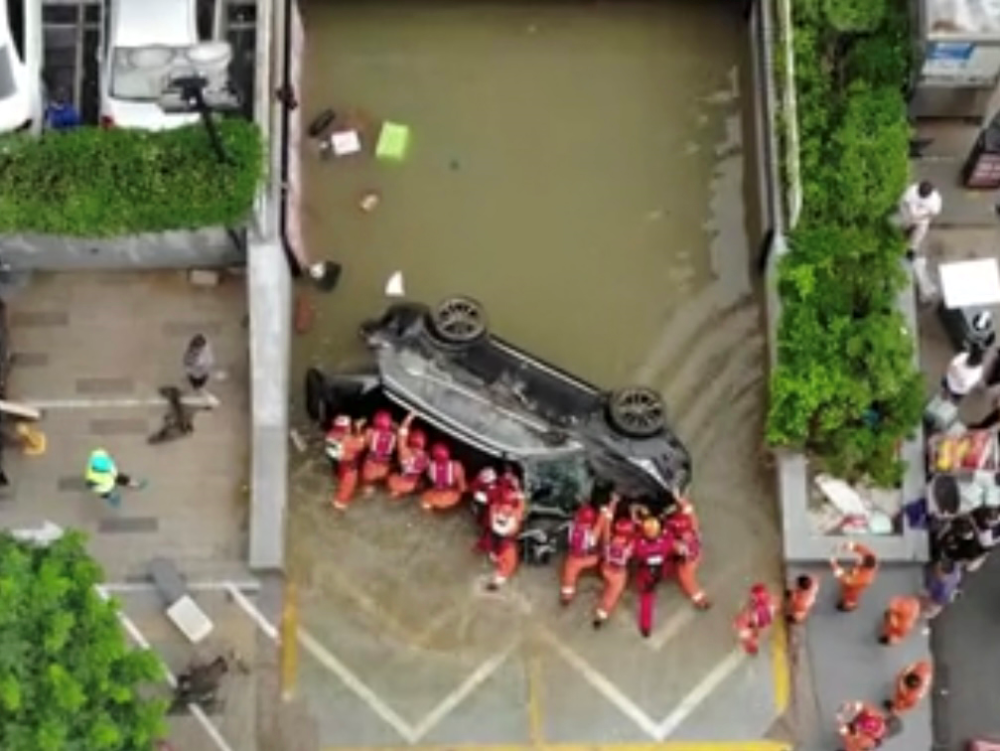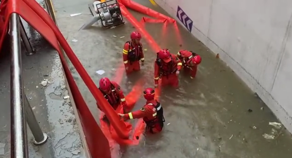 7月21日17点30分,安徽合肥市消防救援支队接到当地请求,位于郑州东风路与经三路交口一地下停车库被水淹没,面积1.2万平米左右,支队立即出动2套远程供水系统和1台抢险救援车50名指战员,两套远程供水车,进行排涝作业。消防指战员首先将堵在车库的车辆固定并牵引出来,然后清理水里杂物再进行排涝。目前救援仍在紧张进行中。