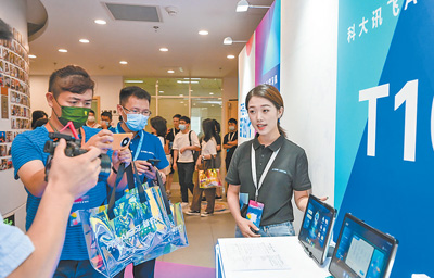 在科大讯飞AI学习机新品体验区,讲解员正在介绍产品功能。资料图片
