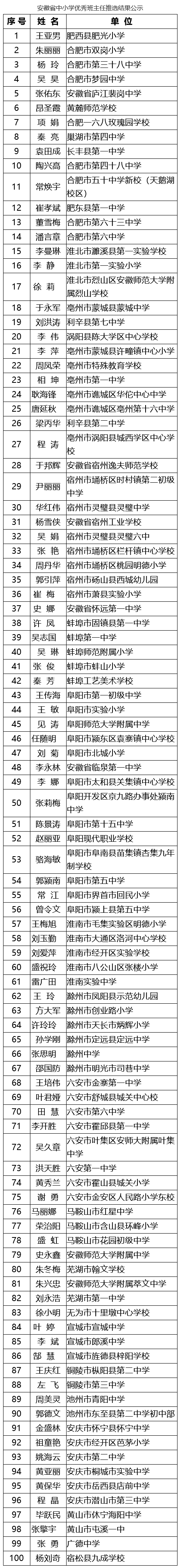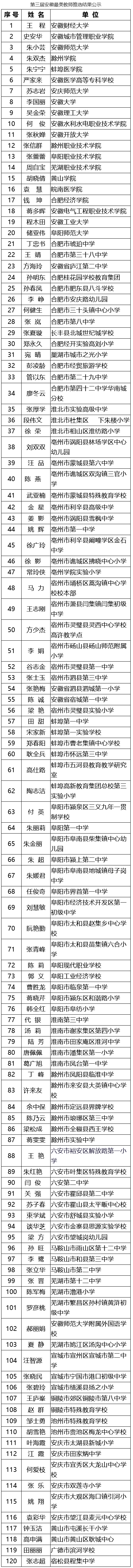 根据《安徽省教育厅关于组织开展安徽省中小学优秀班主任和第三届安徽最美教师评选活动的通知》(皖教秘师〔2021〕48号)文件精神,经安徽省中小学优秀班主任和第三届安徽最美教师推选委员会推选,王亚男等100名教师为安徽省中小学优秀班主任、王程等120名教师为第三届安徽最美教师人选,现予公示。公示时间为2021年8月29日-9月3日。