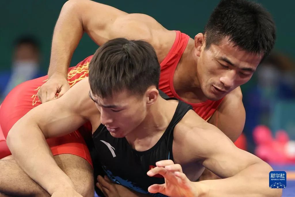 9月25日,田企业(图中红衣选手)获男子古典式摔跤67公斤级比赛金牌。