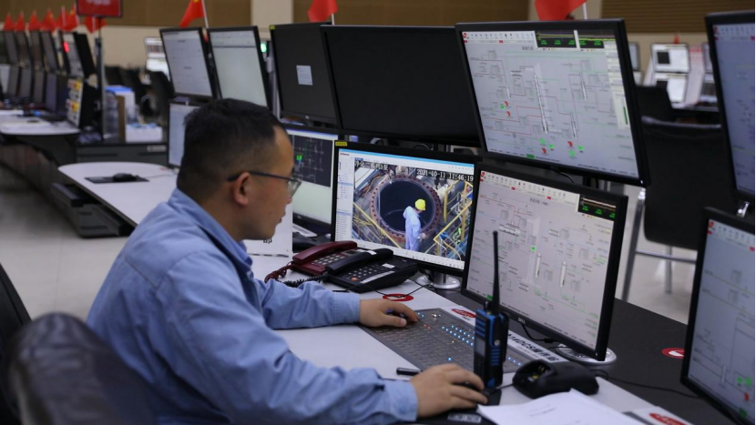图为中安联合的工作人员在调度室内与室外作业的工人正进行技术沟通