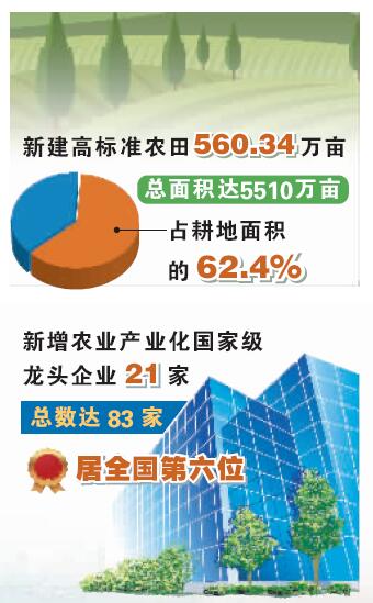 大力推进科技强农。加快农业“四新”科技成果转化,推进种业振兴,促进种养业提质增效,实施农业全产业链建设、绿色循环发展、数字赋农等行动。大力推进机械强农。加快优势农机制造产业集群建设,强化农机研制补短板,组建农机装备创新研发推广联盟。开展主要农作物生产全程机械化示范创建,提升农机社会化服务能力,推进农业“标准地”建设,新建高标准农田510万亩。