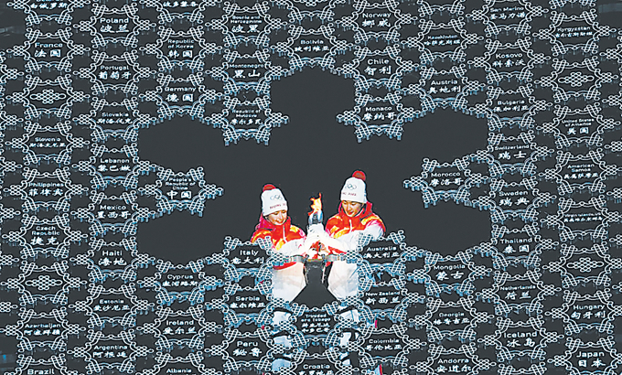 2月4日晚,第二十四届冬季奥林匹克运动会开幕式在北京国家体育场举行。这是最后一棒火炬手迪妮格尔·衣拉木江 (左)和赵嘉文将火炬嵌入 “大雪花”中央。新华社记者 李尕 摄