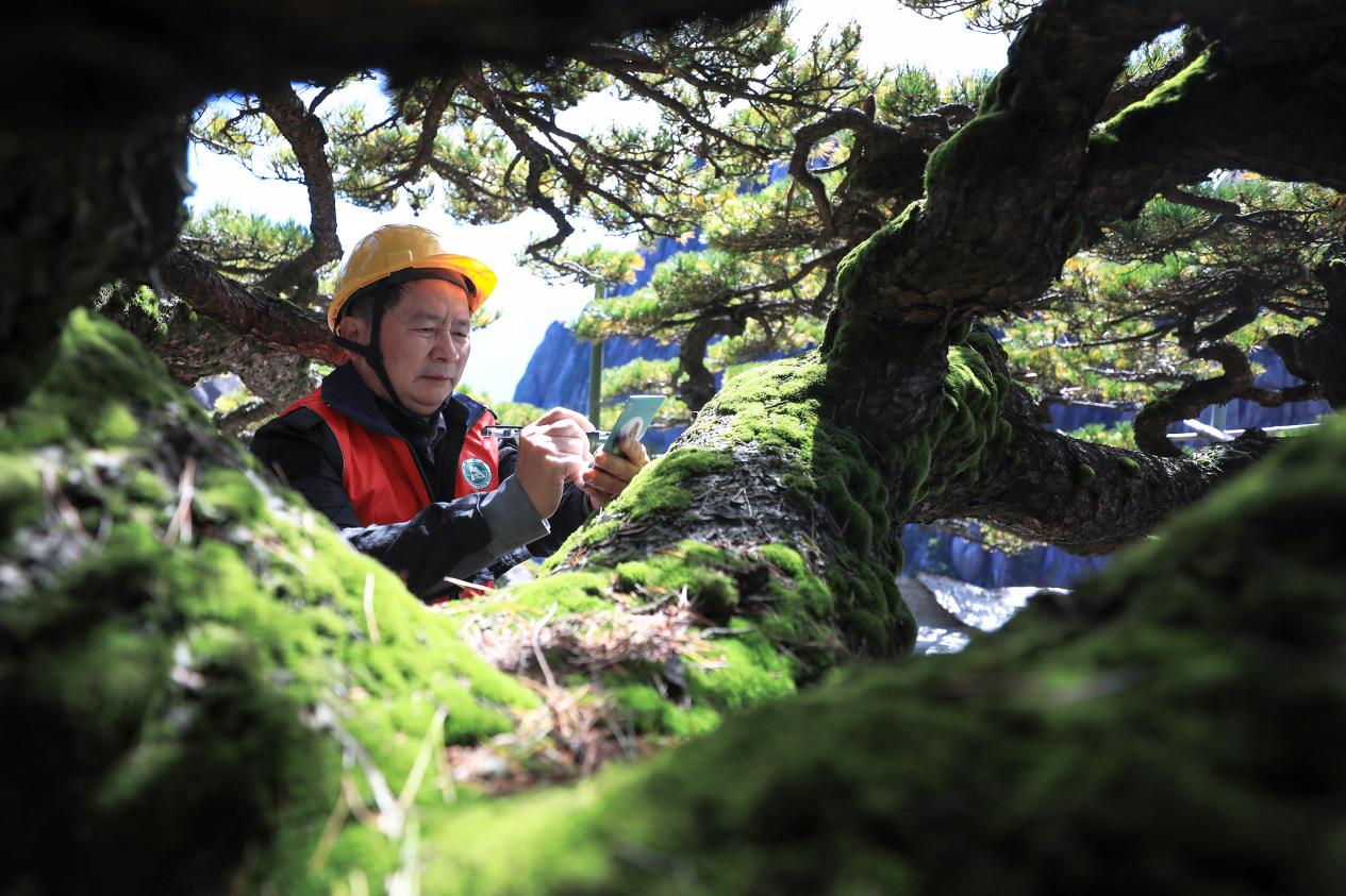 专家组成员、安徽省林业科学研究院、高级工程师胡一民认真记录迎客松生长情况 樊成柱/摄