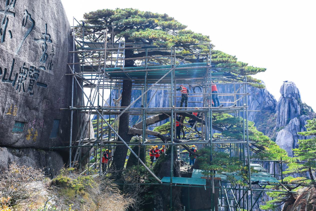 10月20日,在黄山之巅的玉屏峰旁,正在进行第五次全面体检的迎客松迎来千年“树生”中一群特殊的“朋友”。