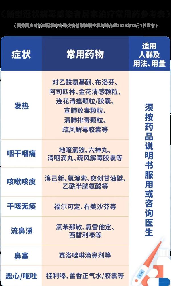 (2)有症状的感染者可以查阅《新型冠状病毒感染者居家治疗常用药参考表》,购买退热、止咳等对症治疗药物。