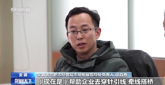 安徽省合肥市经信局市场拓展指导处负责人 徐自舟:对于我们来说,其实身份没有转换,还是服务员,还是为企业服务的。只是服务的内容不一样,(现在是)帮助企业去穿针引线、牵线搭桥,可能充当的更多的是一个“媒婆”的角色。
