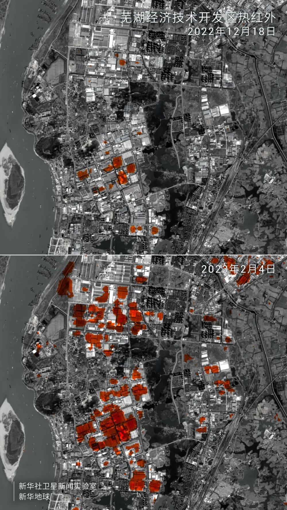 这是遥感卫星拍摄的热红外影像对比图。对比2023年2月4日与2022年12月18日的芜湖经济技术开发区,图中红色区域面积明显增大,这意味着随着工业生产和人流活动不断增加,地表温度相对上升,令人直观感受到这里开年开局的“热力值”。