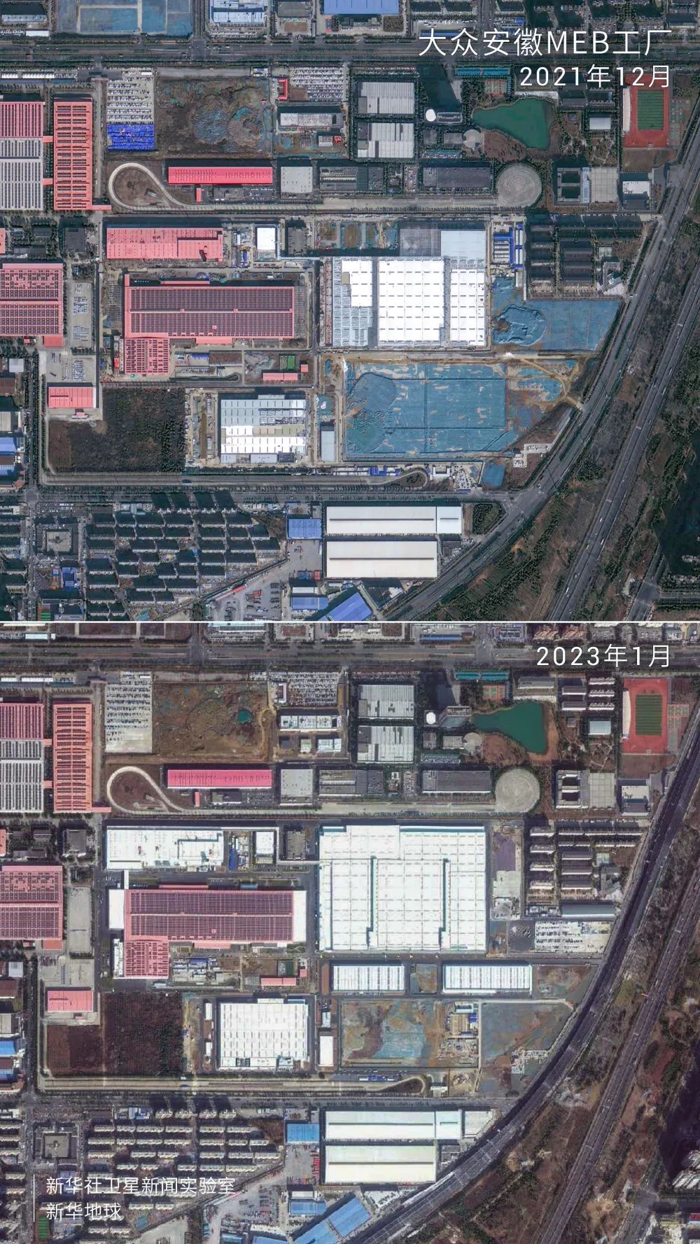 卫星见证,与2021年12月相比,2023年1月大众安徽MEB工厂区域内建筑面积更大、道路更规整。作为大众汽车集团在中国的第三家MEB(模块化电驱动平台)工厂,大众安徽MEB工厂目前已全面建成,首款车型将于2023年年底投产。