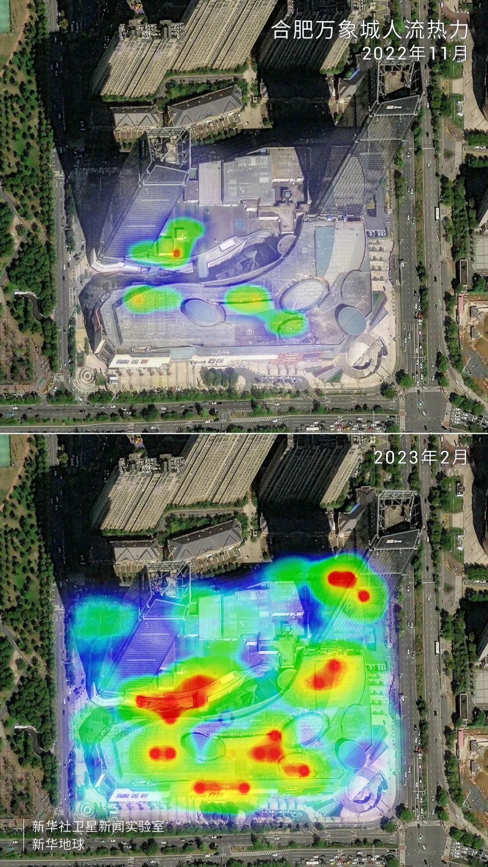 合肥万象城集聚了众多商家,与2022年11月相比,2023年2月的人流热力图上同样增加了一片片耀眼的红色,人们尽情享受生活的美好。