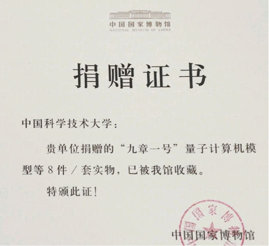 中安在线、中安新闻客户端讯 记者9月4日从中国科大获悉,近期,中国科学技术大学应邀向中国国家博物馆捐赠“九章”量子计算原型机相关科学元器件实物和原始资料。中国国家博物馆对中国科大团队表示诚挚的感谢,并向中国科大颁发收藏证书。