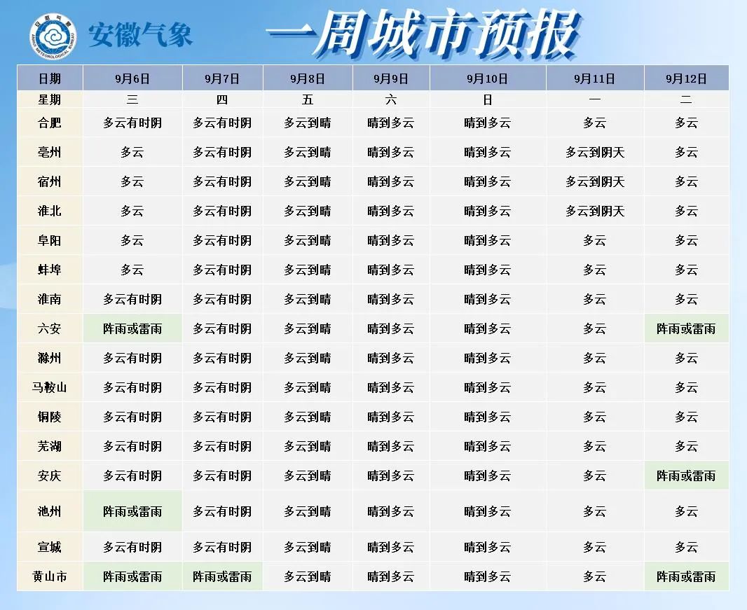 据安徽气象9月6日消息,今天江淮之间部分地区和江南中南部有阵雨或雷雨;7日大别山区和江南局部有阵雨或雷雨;8日至11日全省以晴到多云天气为主。12日大别山区和沿江江南部分地区有阵雨或雷雨。