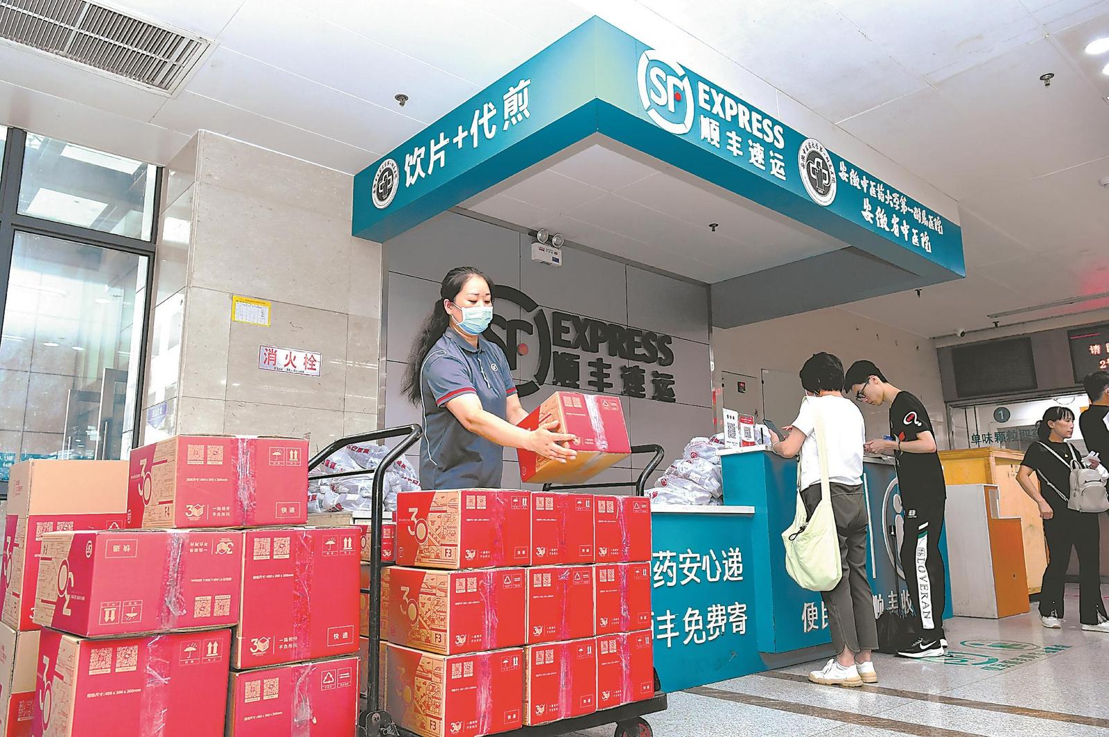 9月12日,安徽中医药大学第一附属医院门诊大厅的顺丰快递站点,快递员将中药打包配送。