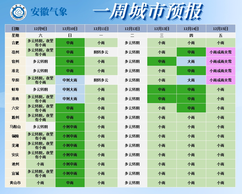 15日(周五):全省阴天。大别山区和淮北部分地区有小雨或雨夹雪;其他地区有小雨。