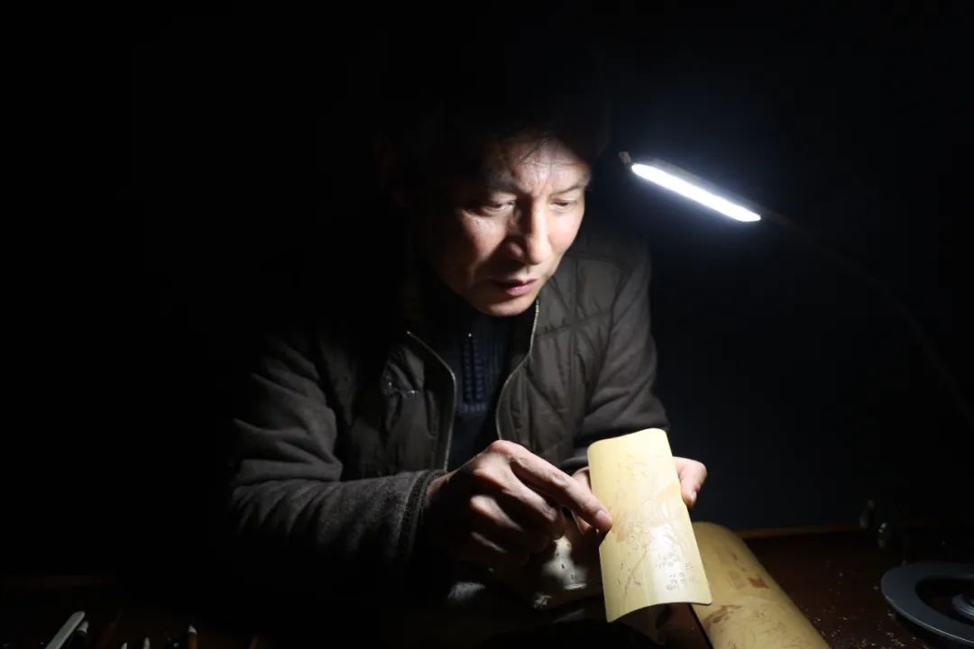 刀,轻轻落在竹片表面,一层竹皮薄如蝉翼,随着汪伟手中刻刀的推进,蜷成了一个卷,掉落在桌面……汪伟目光炯炯,神情专注,行刀如运笔,在不到0.5毫米厚的竹皮上,雕刻出明晦浓淡不同的丰富层次。