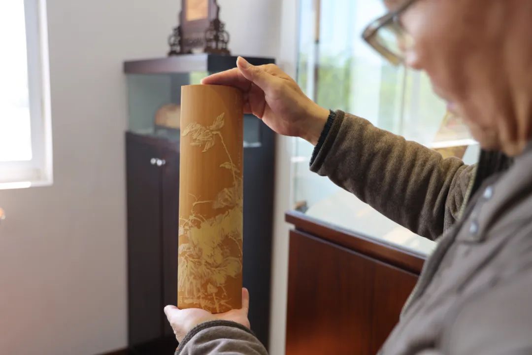 汪伟的工作室,陈列着数十件精美的竹雕作品,令人目不暇接。咫尺之间,山水气韵生动、虫鸟灵巧精微、花草雅致飘逸、人物真切传神……尽显竹刻的材质美感与刀刻功夫。