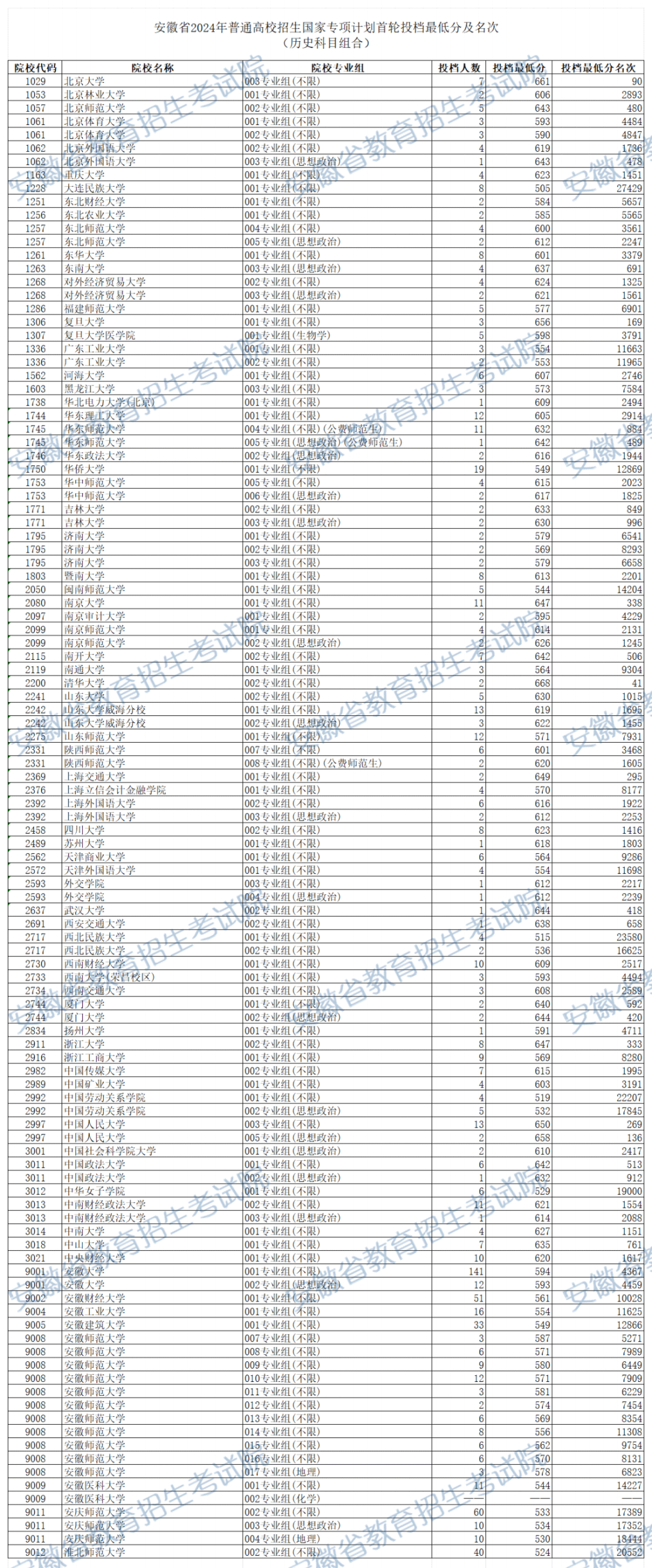 安徽省2024年普通高校招生国家专项计划首轮投档最低分及名次(历史科目组合)