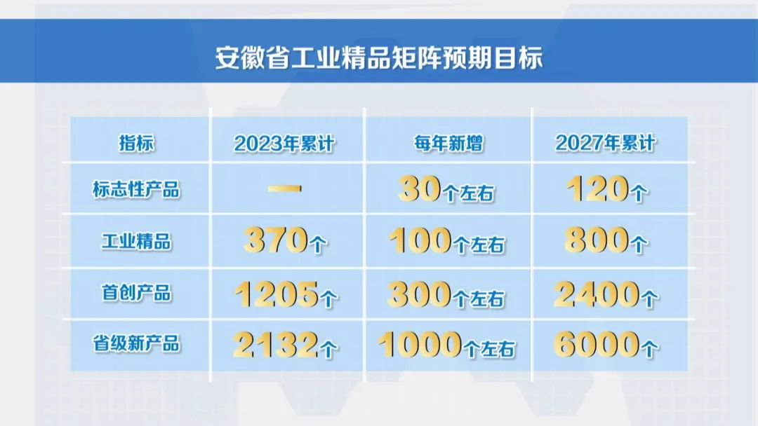 《方案》提出,安徽将进一步打通科技成果转移转化通道,统筹专项资金对相关企业进行奖补,鼓励各市出台配套支持政策,引导金融机构加大纯信用、低成本信贷投放等,合力推动产品创新、产业发展。力争到2027年,初步形成从省级新产品到首创产品到工业精品、再到标志性产品的梯次矩阵,有效提升“安徽制造”的附加值、美誉度和竞争力。