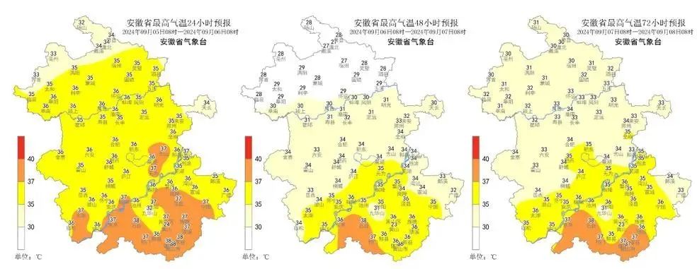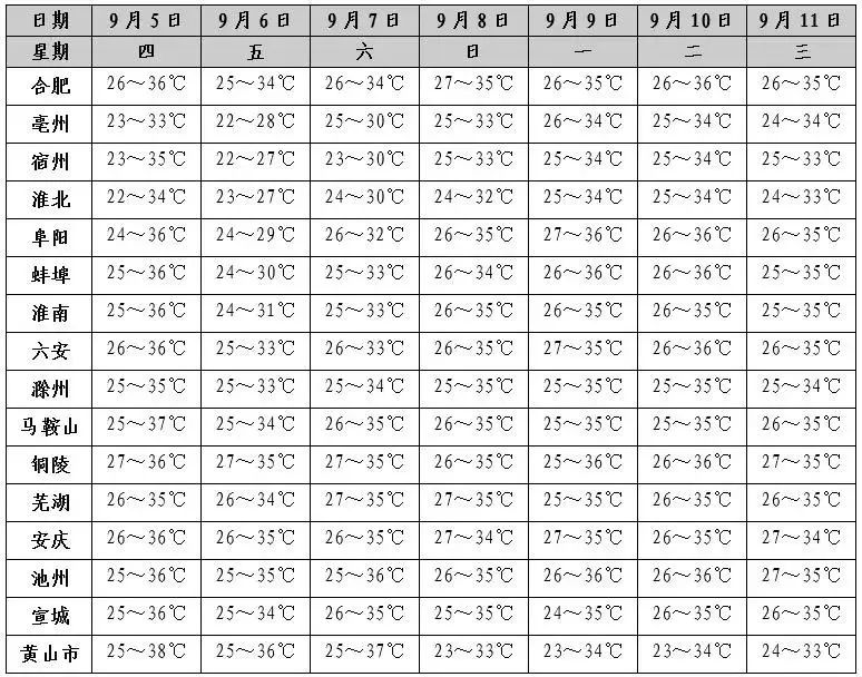 安徽省气象台预计,9月11日前全省仍以高温天气为主,除5日淮北地区北部、6日至7日淮北地区和江淮之间北部最高气温低于35℃之外,全省最高气温普遍为35~37℃,江南部分地区可达38℃。