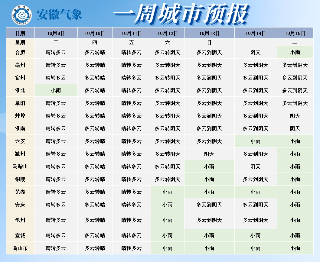 据安徽气象消息,10月9日,安徽发布未来一周全省天气预报,9日至11日全省以晴到多云天气为主。12日沿淮淮河以南、13日至14日大别山区和沿江江南的部分地区有小雨;15日起我省有一次降水过程。未来一周全省最高气温23~27℃。