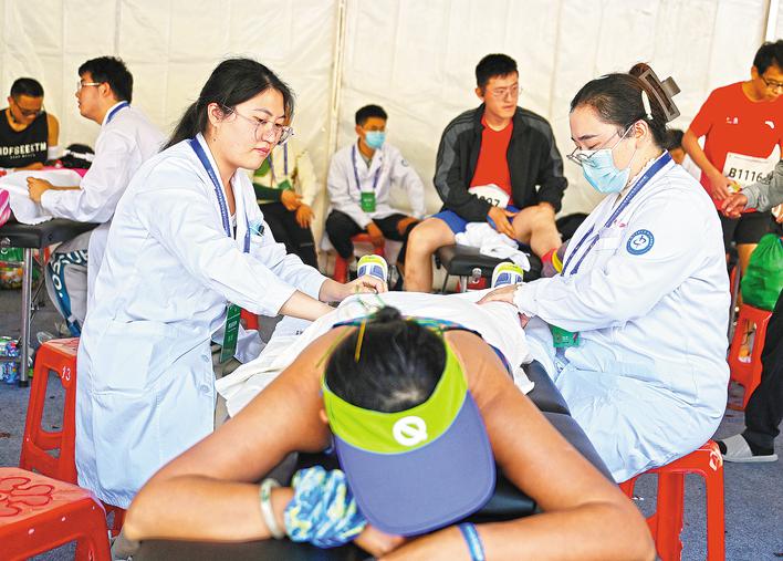 拉伸放松区最大的站点是安徽省针灸医院的工作区,这里的百人医护团队提供推拿、针灸、艾灸、拔罐等中医药特色服务。一位武汉的跑友在接受针灸、推拿后笑称,就是冲着这里的康复服务,来跑合马的。