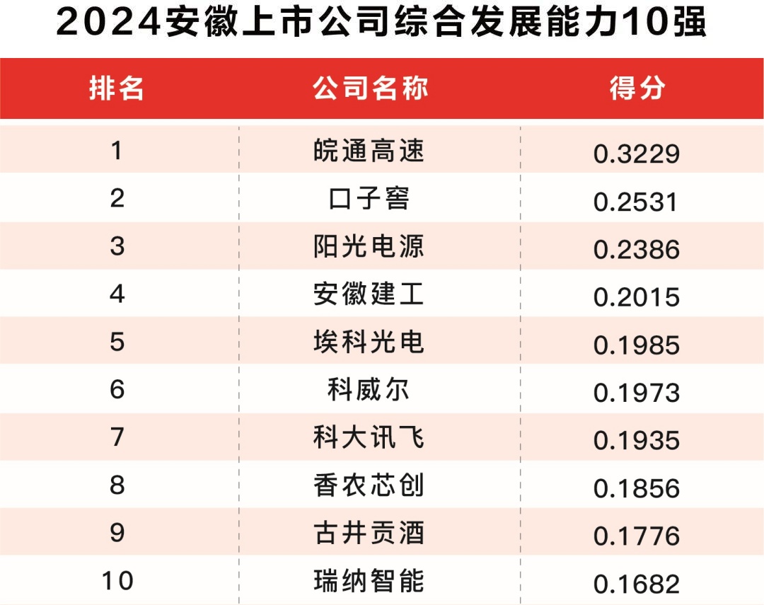 今年的《安徽上市公司发展报告》从业绩发展、创新能力、营运能力、ESG绩效、投融资水平5个维度,综合评价安徽上市公司,形成了综合发展能力排名。从综合发展能力看,皖通高速位列榜首,口子窖表现突出。从业绩发展排名看,排名前十与后十的差距明显。排名前十上市公司中,古井贡酒、迎驾贡酒、华恒生物等保持领先,各项业绩指标稳健。