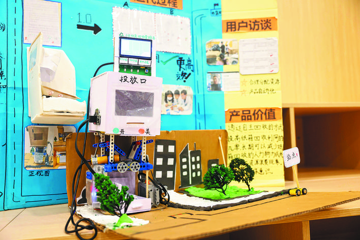 能够自动识别、收纳快递纸盒并记录回收积分的“快递纸盒回收箱”长啥样?钟奕凡、姚瑶、赵梓芃用乐高和纸板搭建起一座快递纸盒回收箱的模型。虽然并不能直接投入实际使用,但其中嵌入了超声波传感器、自动升降检测平台、高效粉碎机以及智能收纳系统等,可以充分演示这一发明装置的功能。