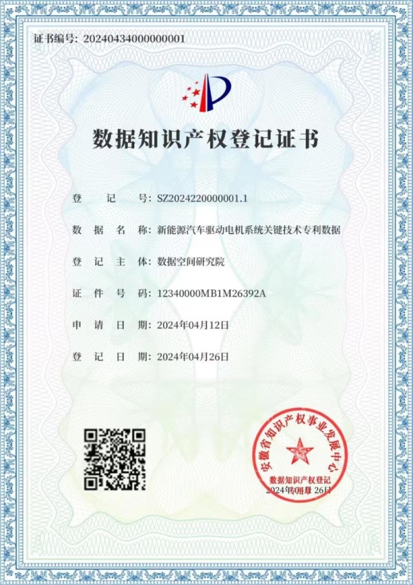 2024年4月26日,在第23个“世界知识产权日”之际,安徽颁发了首批数据知识产权登记证书,合肥综合性国家科学中心数据空间研究院申请的“新能源汽车驱动电机系统关键技术专利数据”获得编号:20240434000000001号证书,成为全省第一张“数据知识产权登记证书”。