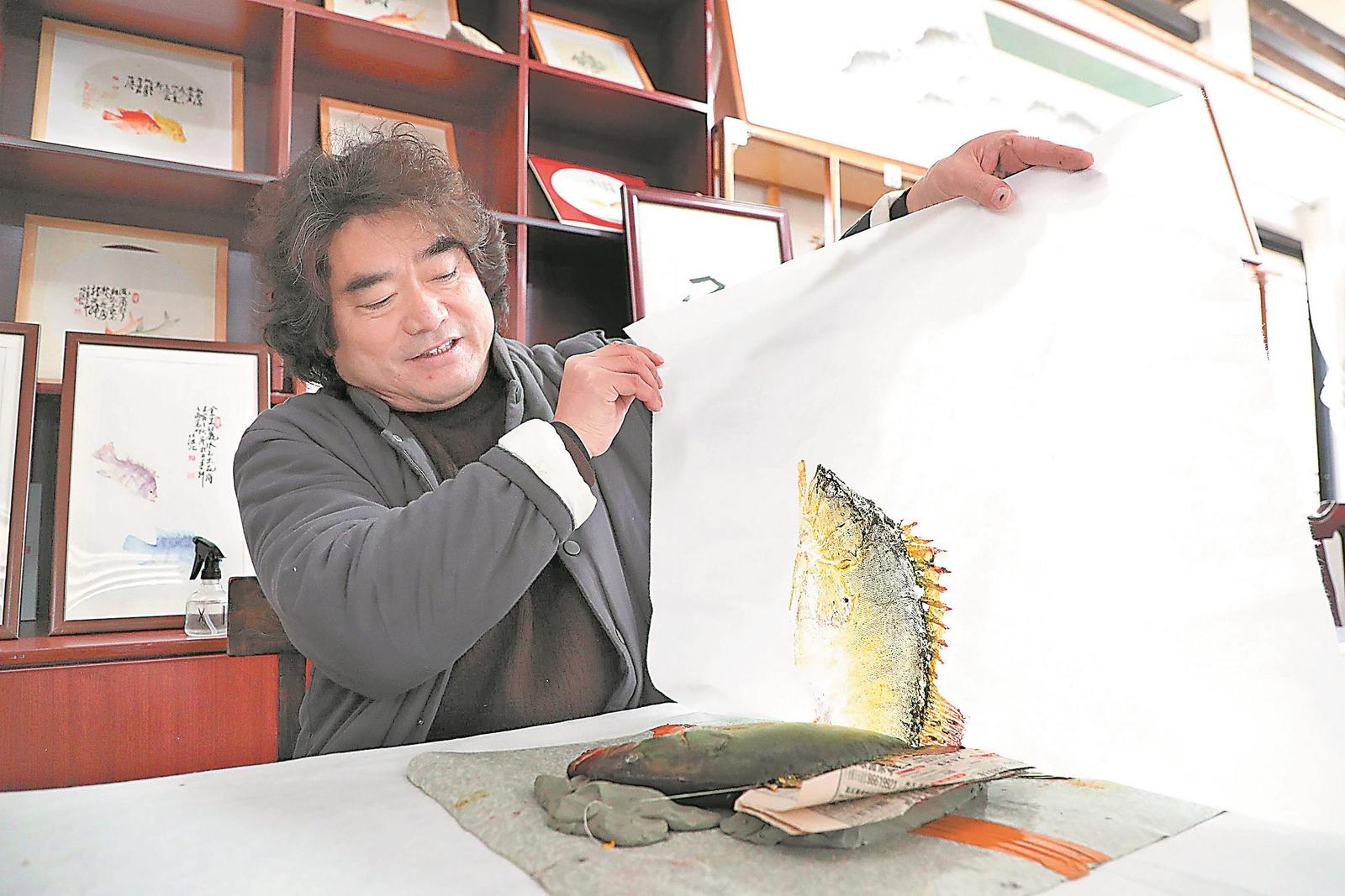 1月9日,界首鱼拓艺人胡继江展示刚刚拓好的鱼拓作品。记者 李季 摄
