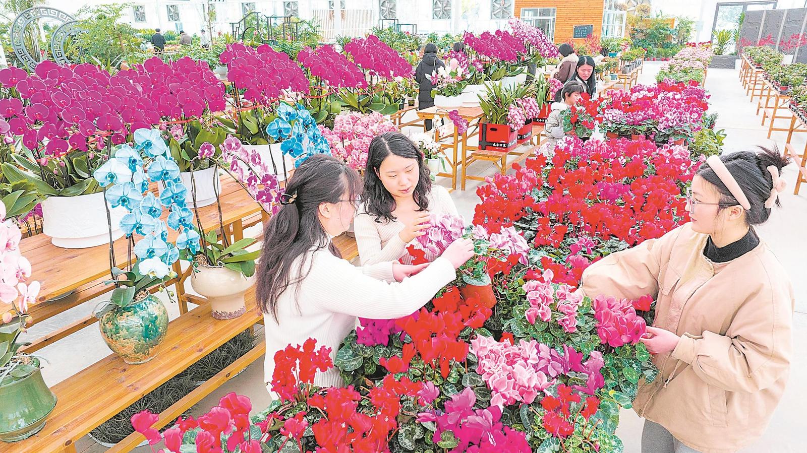 1月26日,在郎溪县涛城镇庆丰村美迪花世界农业合作社的基地里,市民纷纷前来选购心仪的花卉。通讯员 李晓红 摄