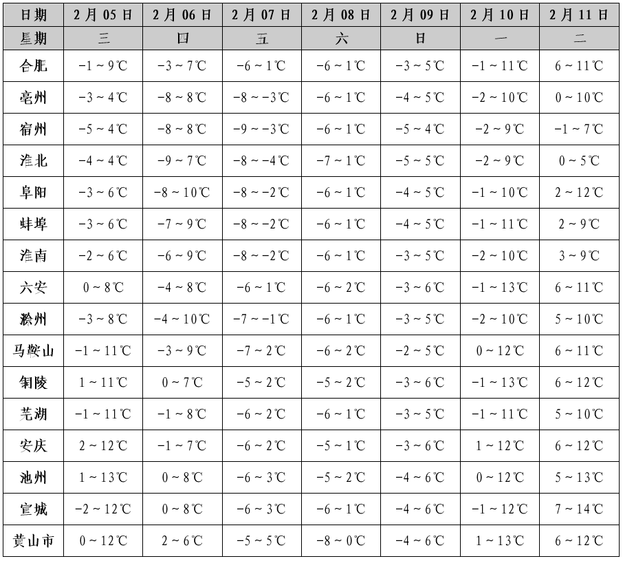 具体到安徽,省气象台预计,2月5日至9日全省以多云天气为主,仅6日江南南部局部有弱降水。10日至12日和14日淮河以南分别有一次降水过程。