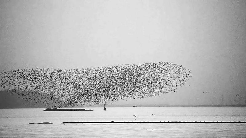 2月4日,在巢湖桂花台区域,合肥市生态摄影师张忠东捕捉到巢湖上空一幕罕见的“鸟浪”奇观。这绵延数公里的“鸟浪”在巢湖上空翻飞,形态宛如一条巨大的鲸鱼,令人联想到电影《大鱼海棠》中的震撼场景。
