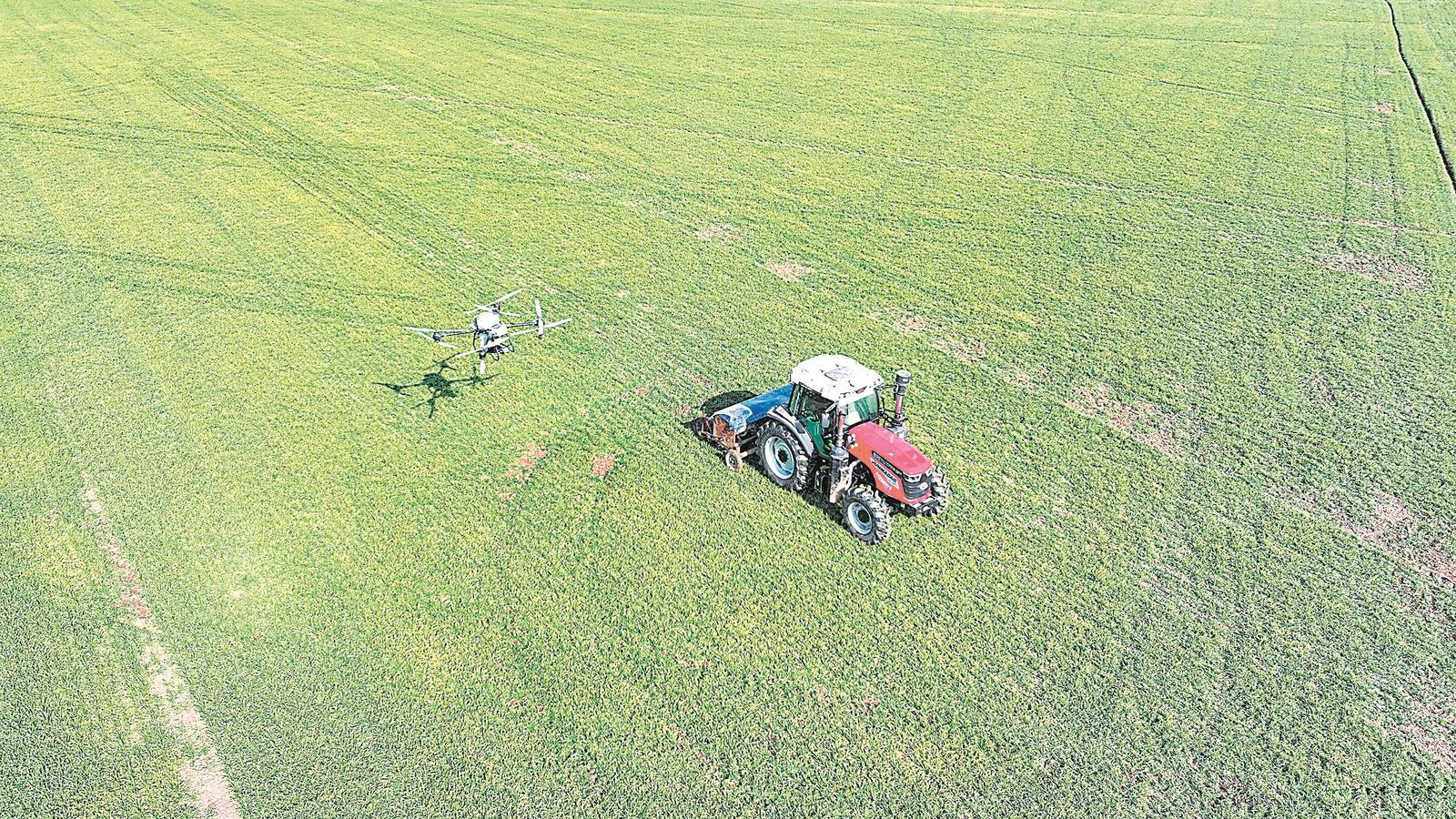 2月4日,蚌埠市五河县头铺镇东来家庭农场,农民操作农机和无人机给小麦施肥。 通讯员 李向前 摄