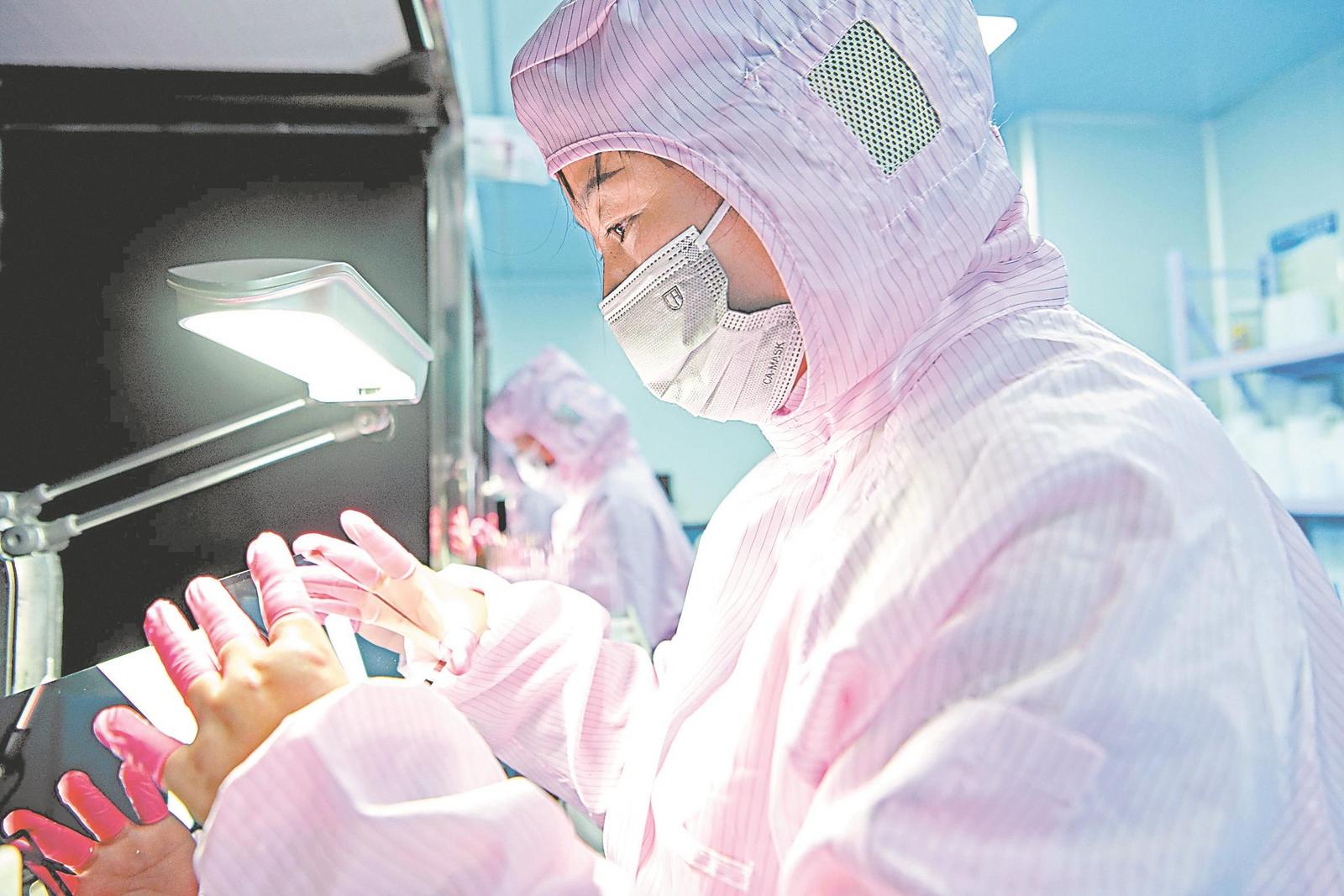 2月5日,位于淮南市高新区的安徽晶桥光电科技有限公司内,工人在检测显示屏。通讯员 陈彬 摄