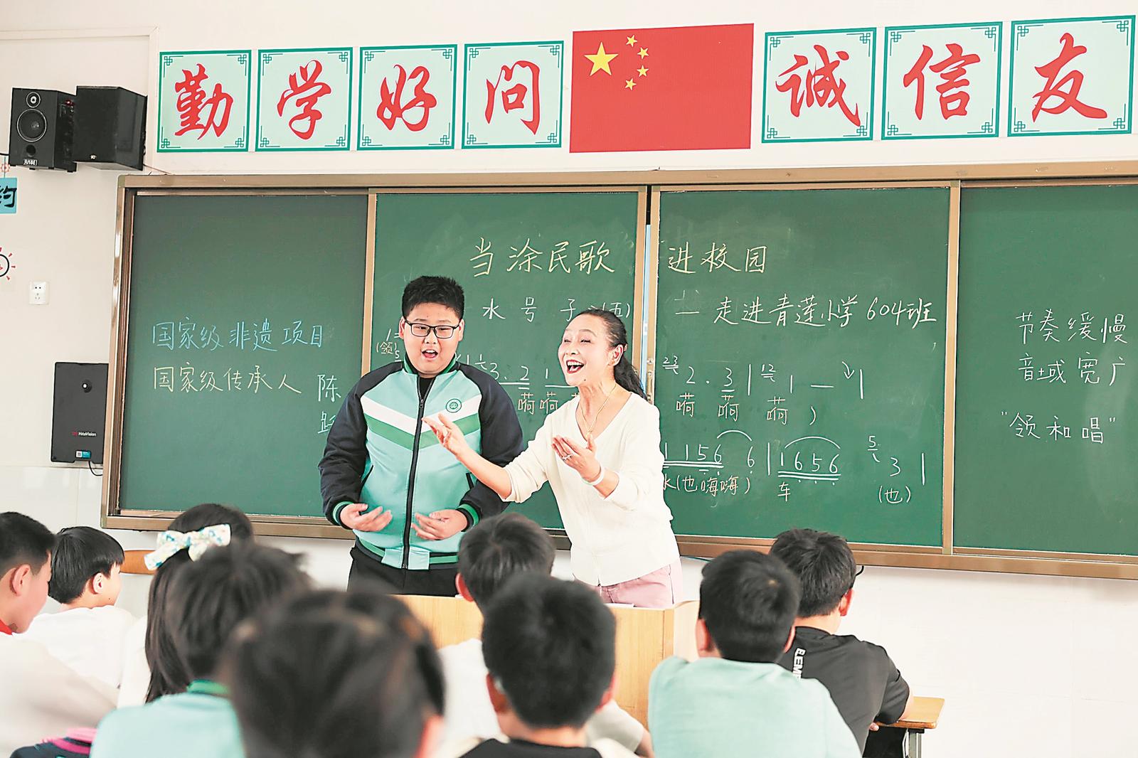 3月26日,陈跃兰走进当涂县青莲小学六(4)班给学生上了一堂生动的民歌课。