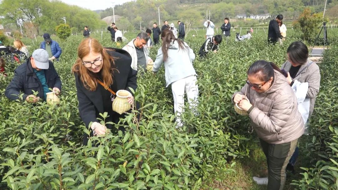 在宣城市绩溪县家朋乡梅干岭,层层叠叠的梯田油菜花与远处的高山以及白墙黛瓦的古村落相映成趣、如诗如画。当地结合油菜花文化旅游推广季,推出一系列赏非遗、品美食活动,铺就了乡村振兴的“金色”道路。看十里花开,采半盏春浓。近日,40多位来自德国、俄罗斯、西班牙等17个国家的外籍友人,来到合肥市庐江县茶旅研学基地,体验采茶、炒茶、品茶,沉浸式打卡美丽茶乡。