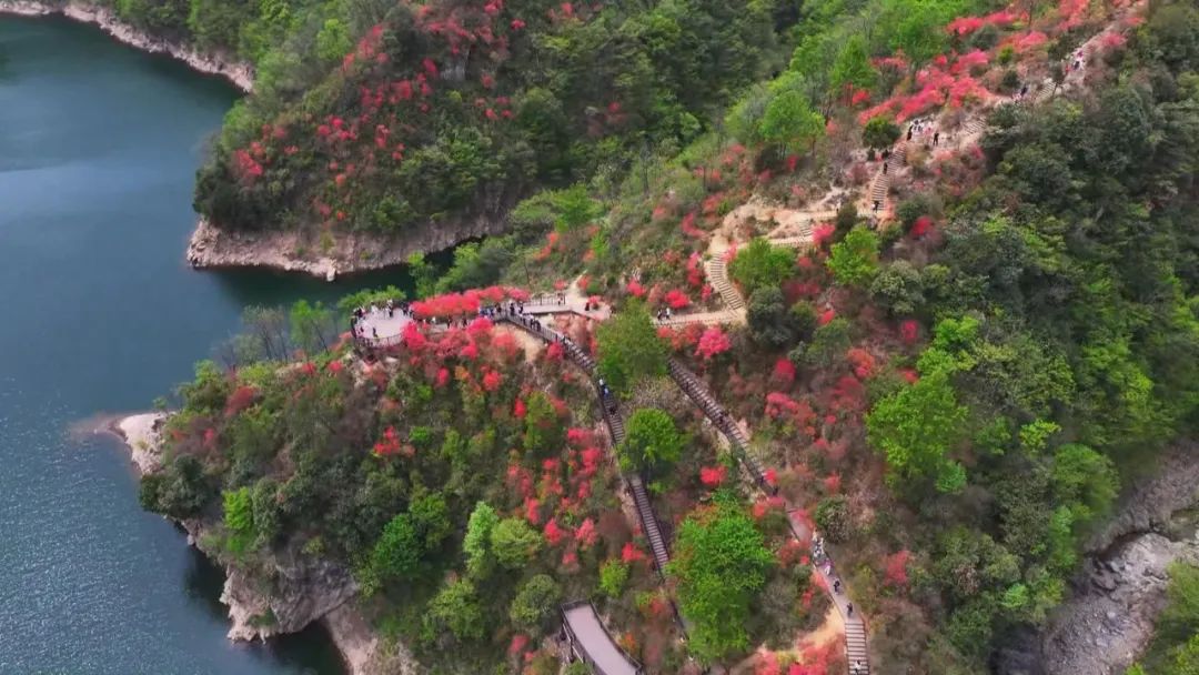 春和景明,繁花似锦。六安市金寨县铁冲乡万亩野生映山红热烈绽放,迎来了最佳观赏期。游客们沿着蜿蜒步道边走边看,欣赏着大别山脉与花海交织的壮丽画卷。