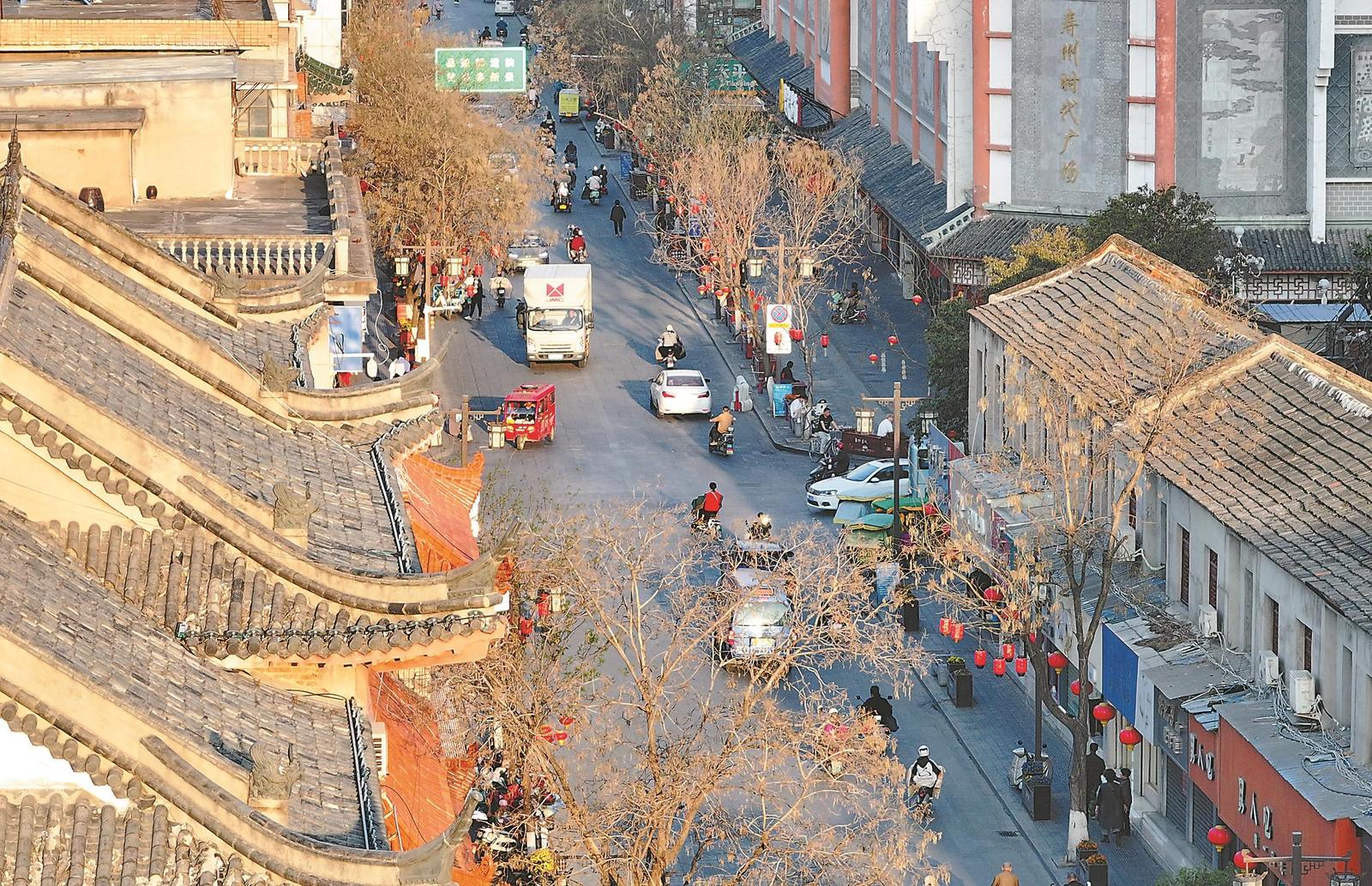 一排店铺前面的小广场,见证了附近居民午后的时光,也见证了四海游客繁忙的旅程。一辆接着一辆的观光车,将游客从通淝门送至宾阳门,古城之旅由此开始,从楚风汉韵到明清风貌的历史之旅也由此开始。