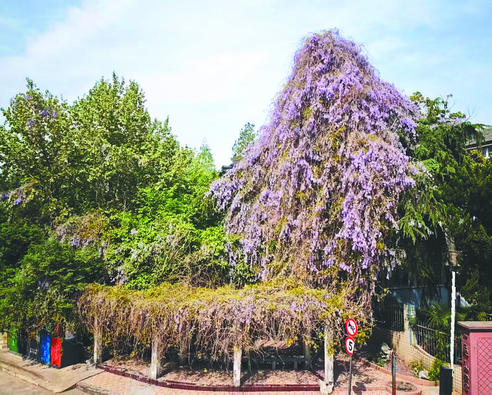 4月11日,记者来到合肥市少年儿童图书馆的合肥六中宿舍旁,见到了这处令人陶醉的美景。还未靠近,远远便能看到那高约十米多的紫藤,层层叠叠的淡紫色花穗如紫色的瀑布般倾泻而下,完美复现了语文课本中宗璞笔下《紫藤萝瀑布》的梦幻场景,浪漫至极。