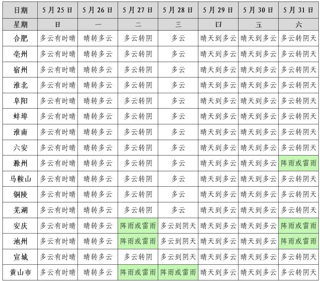 27日:全省多云转阴天,大别山区南部和沿江江南西部有阵雨或雷雨。
