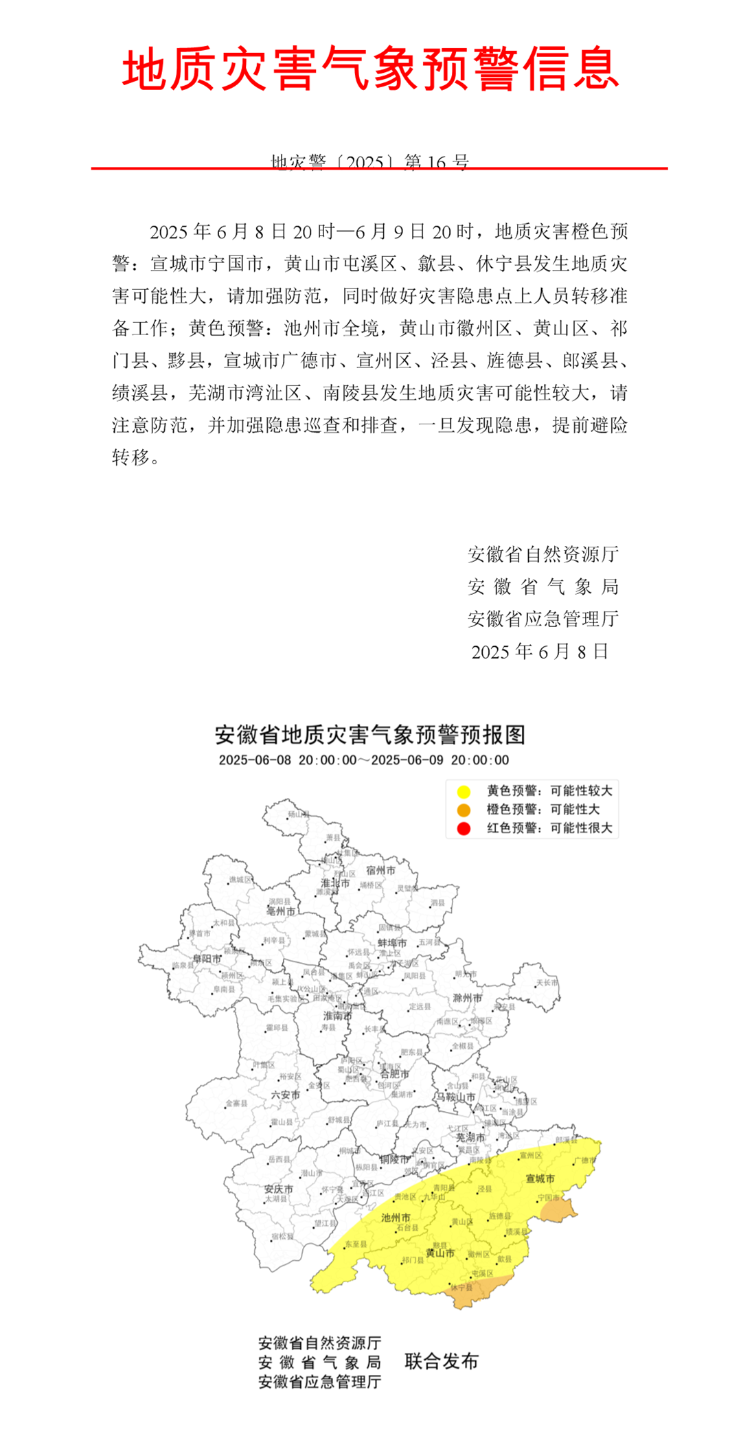 2025年6月8日20时—6月9日20时,发布地质灾害橙色预警:宣城市宁国市,黄山市屯溪区、歙县、休宁县发生地质灾害可能性大,请加强防范,同时做好灾害隐患点上人员转移准备工作;黄色预警:池州市全境,黄山市徽州区、黄山区、祁门县、黟县,宣城市广德市、宣州区、泾县、旌德县、郎溪县、绩溪县,芜湖市湾沚区、南陵县发生地质灾害可能性较大,请注意防范,并加强隐患巡查和排查,一旦发现隐患,提前避险转移。