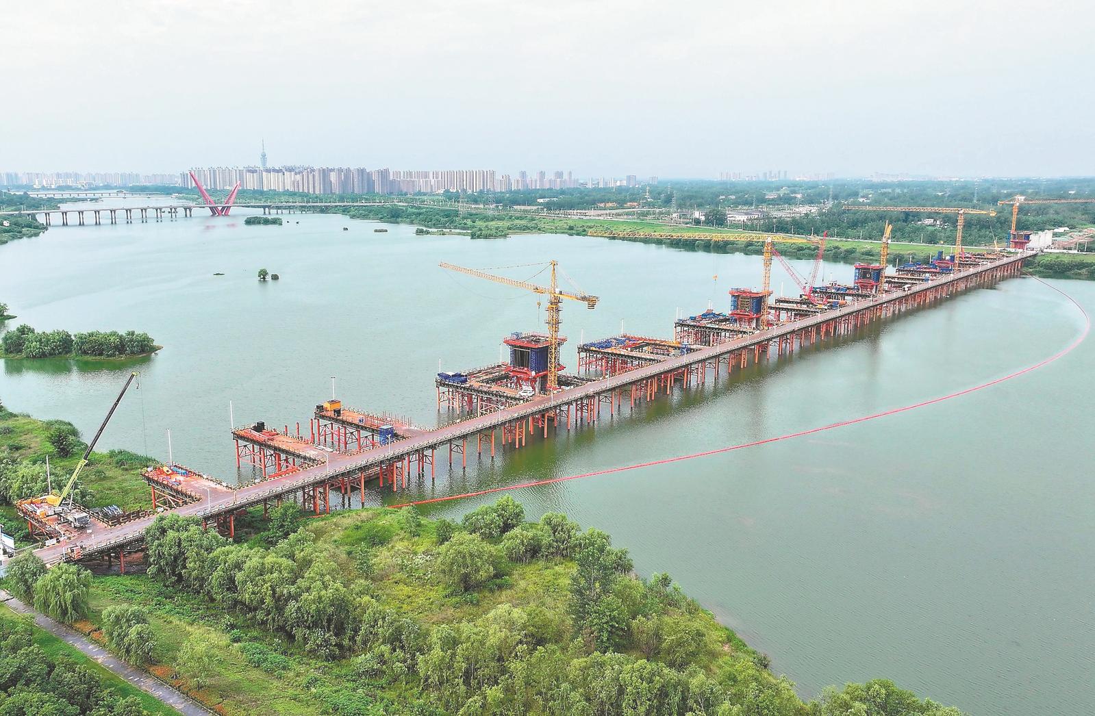 6月15日,合(肥)武(汉)高速铁路六安金裕淠河特大桥施工现场,工人在河面上加紧施工,部分桥墩雏形初现。合武高铁设计时速350公里,预计2028年建成通车。通讯员 田凯平 摄