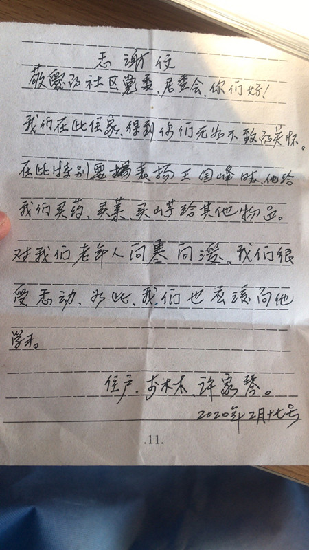 “我们在此住家,得到你们无微不至的关怀,在此特别要表扬王国峰同志……”2月18日上午,当王国峰像往常一样敲开B4栋210许家琴老人家门送物品时,意外收到老人写给疫情防控应急指挥部的手写感谢信。