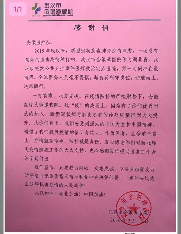 一方有难,八方支援。在疫情防控的严峻形势下,安徽医疗队驰援我院。战“疫”的战场上,因为有了你们优秀团队的加入,新型冠状病毒肺炎患者的诊疗质量得到大大提升。