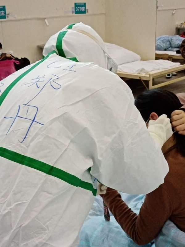 “你好,阿姨,今天觉得怎么样呢?”“我现在就是还咳嗽,咳痰,嗓子不爽快。”“那我今天帮你贴个耳穴,治疗一下吧。”2月25日上午,郑丹来到所在的在武汉东西湖方舱医院的患者身边,为患者进行了耳穴治疗。郑丹一边和病人耐心地解释着耳穴治疗的原理、作用,一边认真地选穴,不断地问她感觉怎么样,有没有得气,贴完还告诉她每天怎么按压,怎么护理,注意事项是什么。