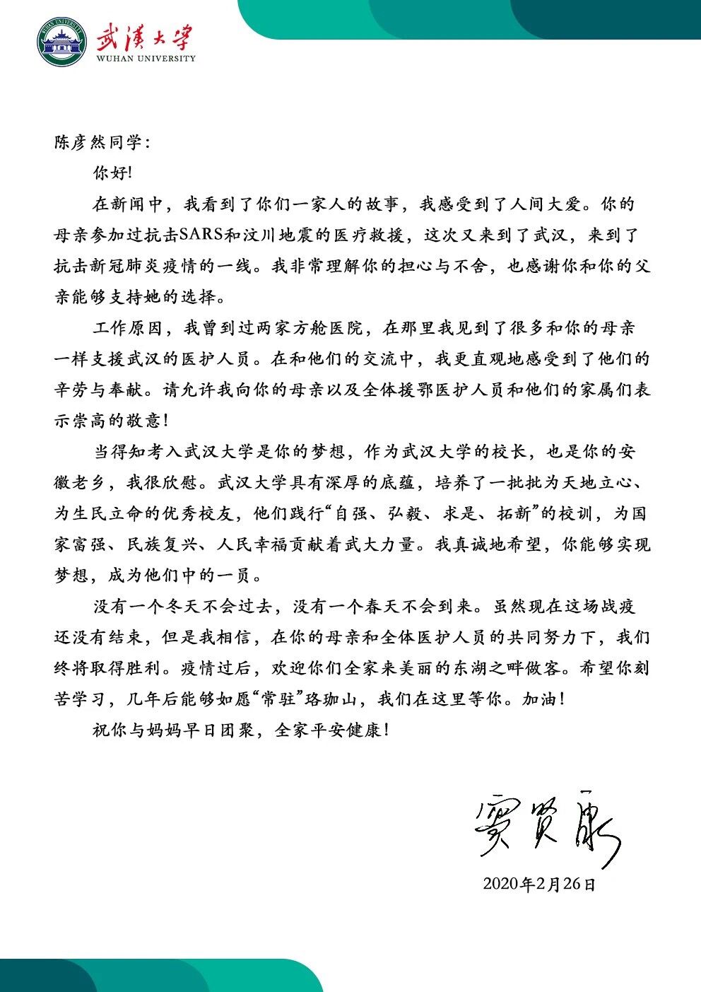“我一直都喜欢武汉大学,妈妈临行前告诉我,她要去那里打仗了。武汉现在生病了,我得努力治好她。”陈彦然说。得知这个消息后,武汉大学校长窦贤康院士第一时间给陈彦然同学写了这封信,鼓励并祝福她,未来能够如愿“常驻”珞珈山!(记者 陈欣然)
