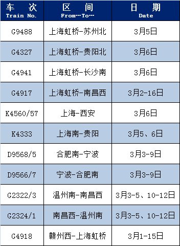 结合复工返程客流变化,在加强疫情防控工作的同时,上海铁路局陆续恢复开行上海虹桥-西安北G1924/5、上海-淮北G7296/7、上海-日照K172/3等部分车次;增开上海虹桥-苏州北G9488、上海虹桥-贵阳北G4327、上海虹桥-长沙南G4941等部分车次。详见↓