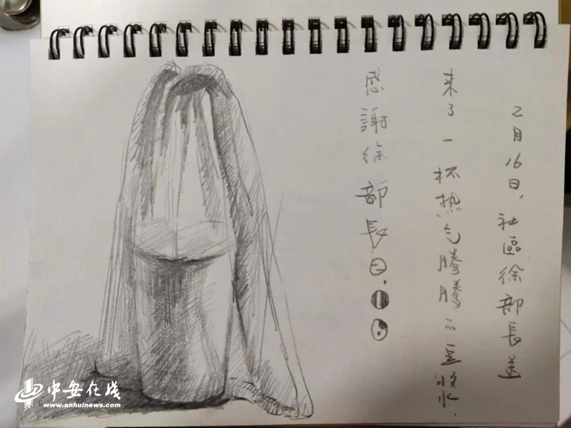 2月16日,刚刚下过雪,天气很冷,下午上班不久,社区徐部长送来了一杯热气腾腾的豆浆,喝完之后感到心里暖暖的。