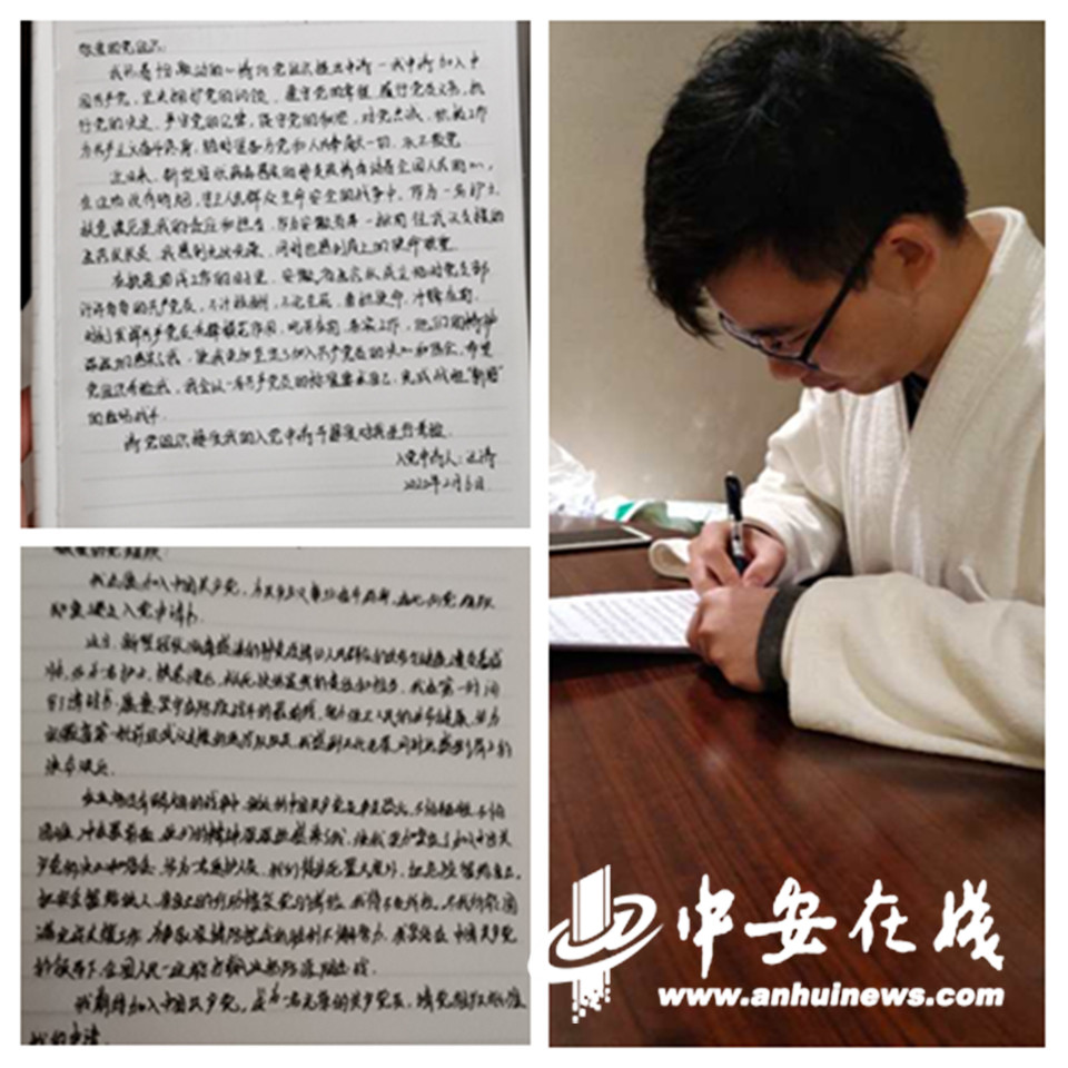 2月8日下午,在隔离病房工作了6个小时的“90后”安庆小伙钱斌斌,回到宾馆,郑重地写下了“入党申请书”
